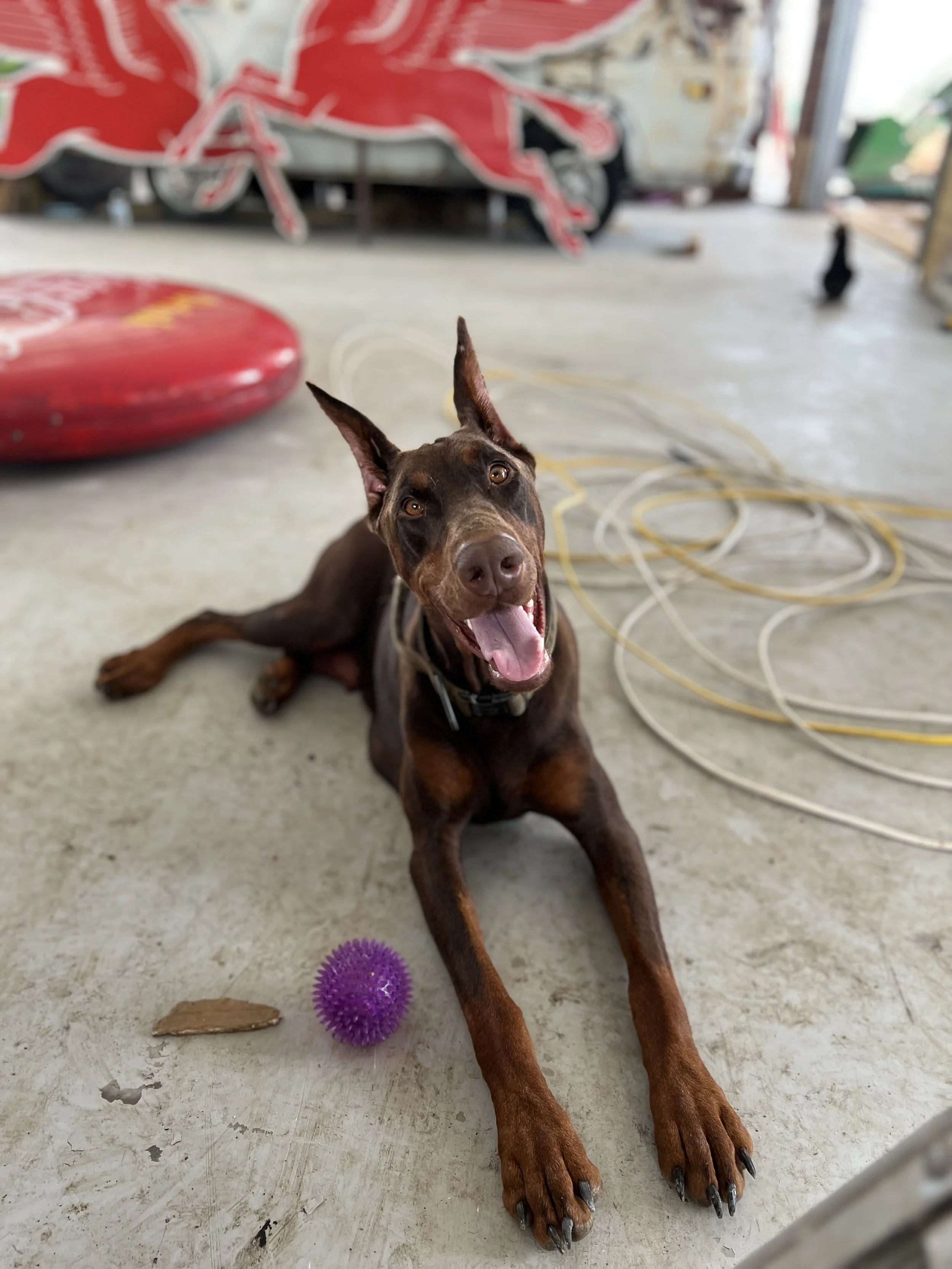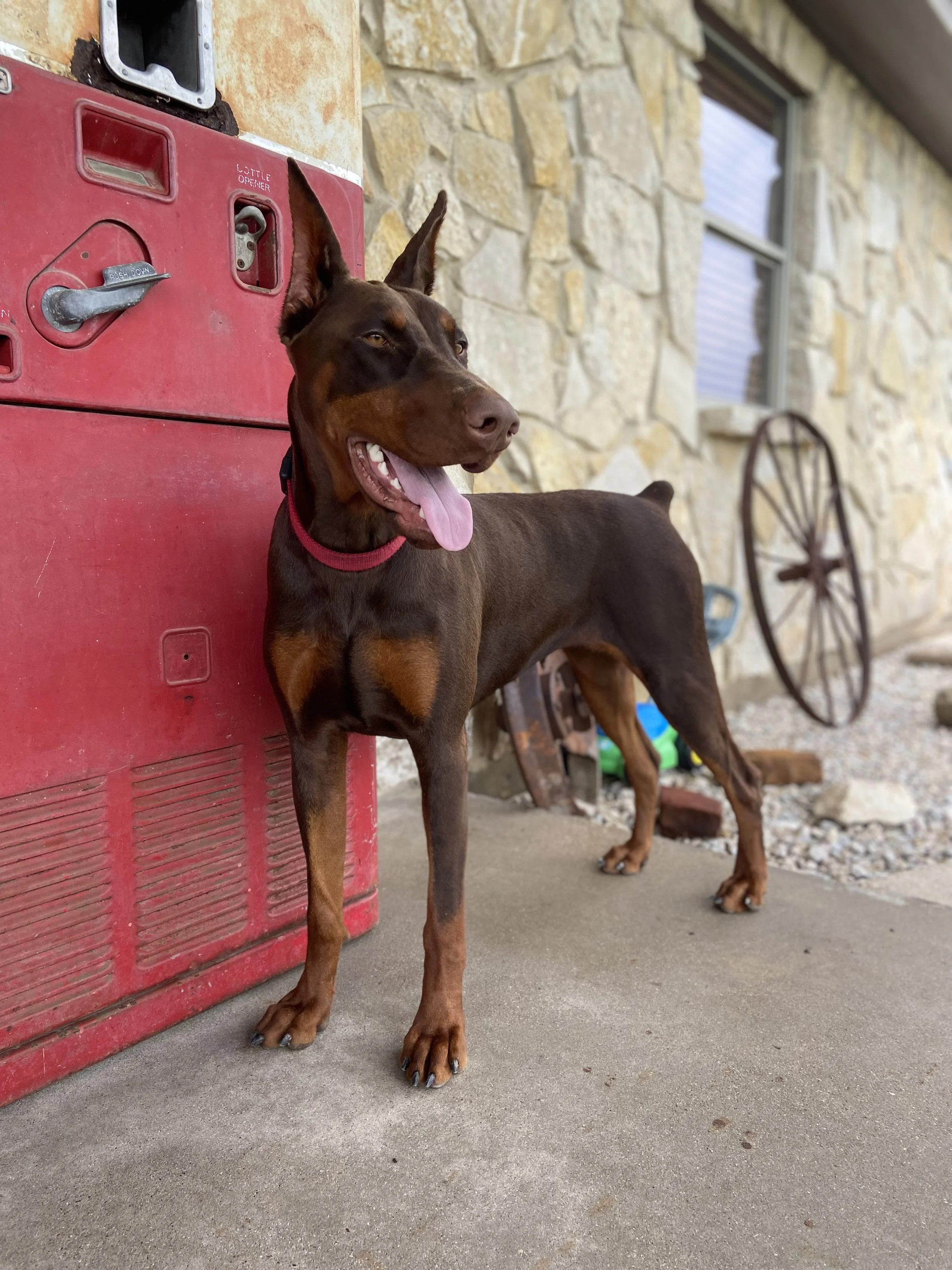 Meet Athena, she is the original face of Red Dirt Dobermans and the Dam of our puppies. She is a 2 1/2 year old, Red Rust AKC Doberman and is 50% American 50% European. Athena exemplifies extraordinary behavior and gentle compassion and is both a fierce defender and a loving mother to our pups.